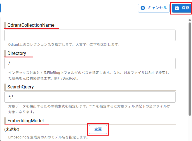 [Directory]:ベクトルインデックス登録対象となるFileBlogのフォルダパスを設定します。広すぎない範囲のフォルダを指定してください。ベクトルインデックス登録時にプロバイダーの従量課金対象となる可能性があります。