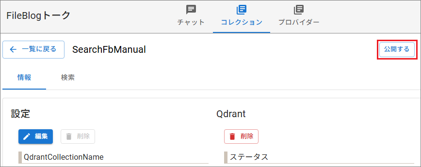[QdrantCollectionName]:名称を登録します。半角英数字が使用でき大小文字は区別されます。チャット設定で参照する[ヒント生成元コレクション]のキーになります。