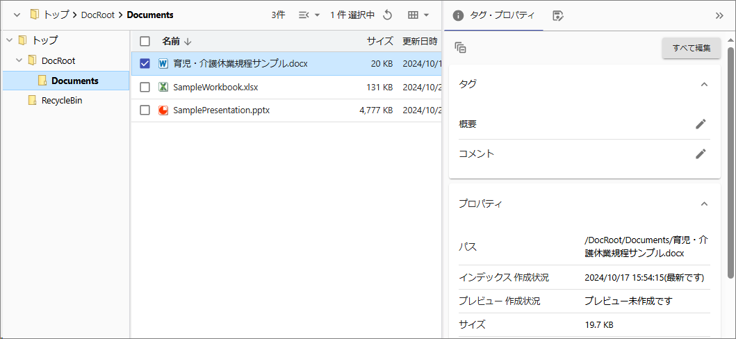 ファイル/フォルダを選択すると当該ファイル/フォルダのプロパティ情報が表示されます。