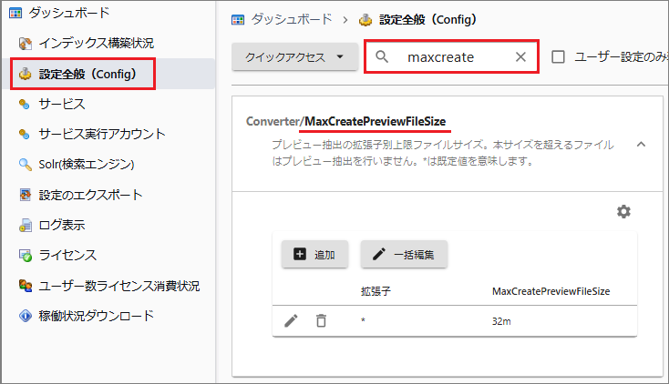 検索インデックスの登録(テキスト抽出)やプレビュー作成にはファイルサイズによる制限があります。