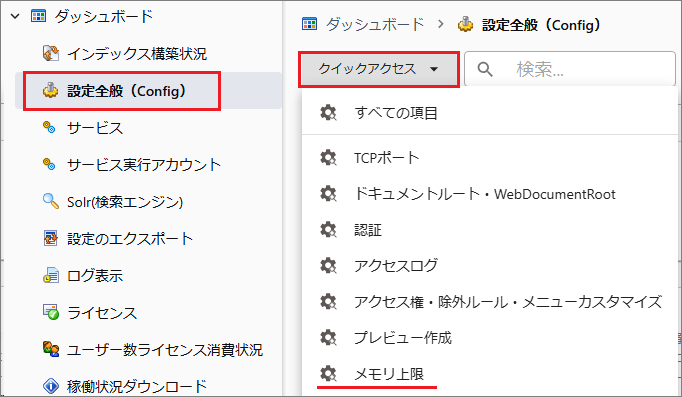 [管理ツール > 設定全般 > クイックアクセス > メモリ上限]を選択します。