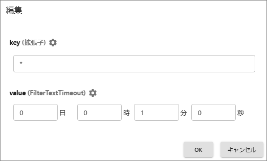 標準既定のペンシル-マークを選択して編集ダイアログで上限値(value)を編集します。ファイル種類別に指定する場合は[追加]を選択して拡張子(Key)を指定します。
