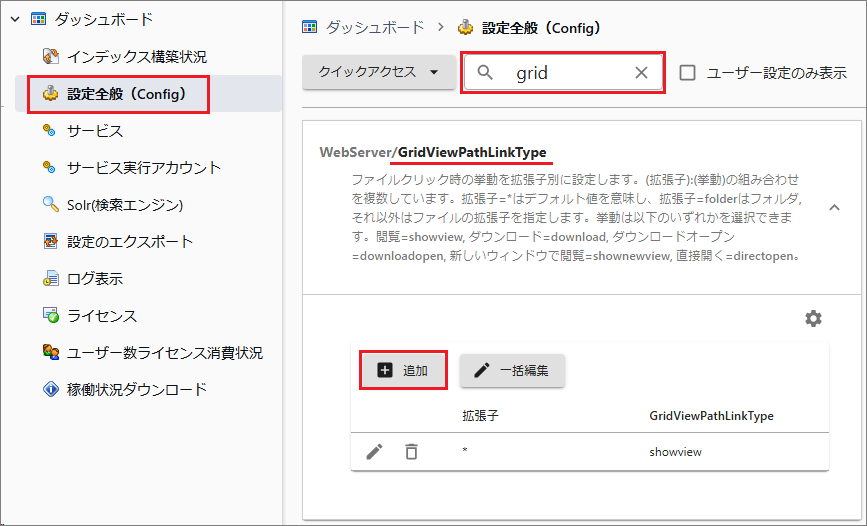 ファイル形式別に動作を定義する: 拡張子別に値を指定します。(既定[ * ]の定義は残します)