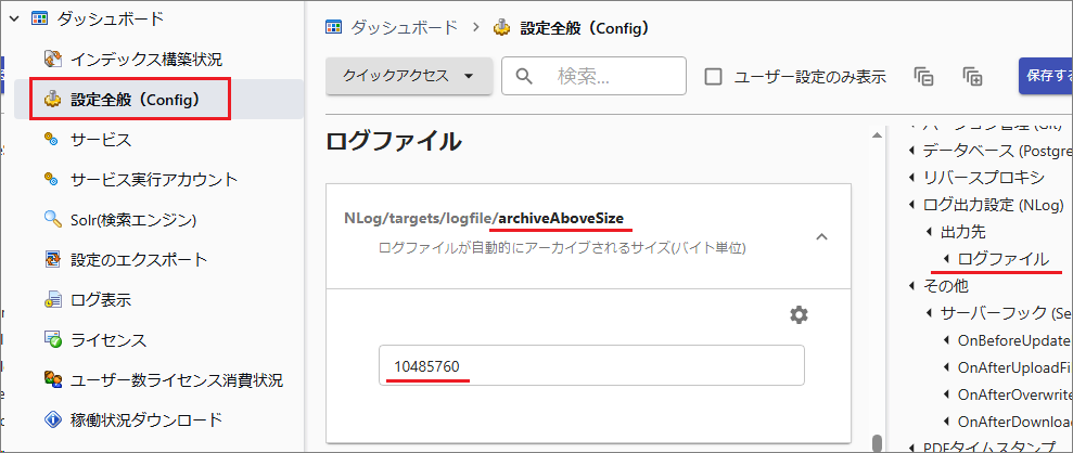 [NLog/targets/logfile/archiveAboveSize]を選択すると、ログファイル(1ファイルあたり)の最大サイズを指定できます。