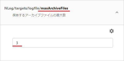 [NLog/targets/logfile/maxArchiveFiles]を選択すると、保持するファイル数の最大値を指定できます。