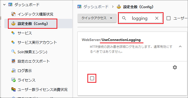 [管理ツール > 設定全般 > logging]で検索します。