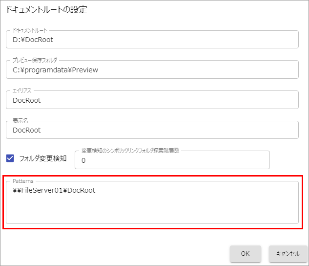 大規模環境で既にインデックス構築済みの場合は再構築に時間を要するため、次のドキュメントルートパターン設定でインデックス再構築なしに本機能を使用できるようになります。なおアクセスベースの列挙(Windows Access-based Enumeration)を有効するには、ドキュメントルートフォルダのUNCパスでの指定が必要です。