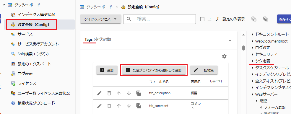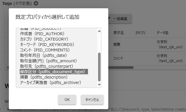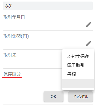「保存区分」タグは標準で[スキャナ保存・電子取引・書類]の値(選択肢)が設定されています。値の変更はタグの定義を参照してください。