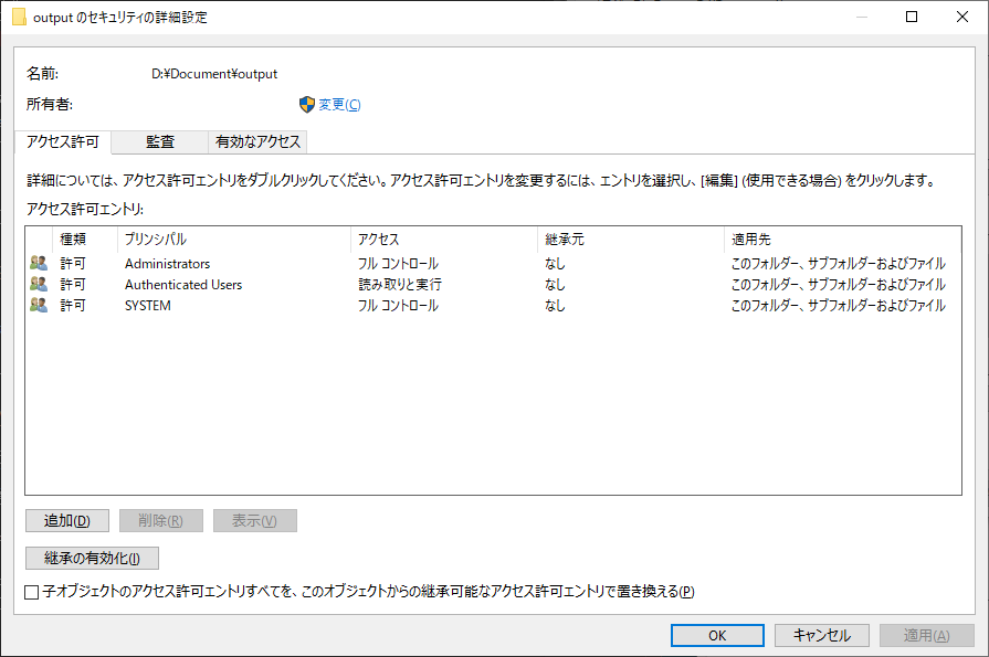 継承の設定は無効にします。([継承の有効化]が表示されている状態です)