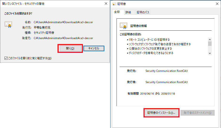 ダウンロードした「ca3-der.cer」ファイルを実行して「開く」を選択します。続けて「証明書のインストール」を選択します。
