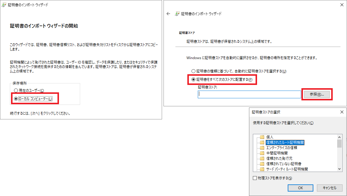 証明書のインポートウィザードに「保存場所:ローカルコンピュータ」が表示されない場合のインストール方法です。インポートウィザードでインストールが完了している場合は実施不要です。