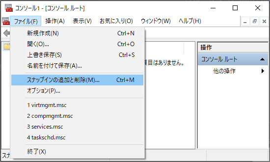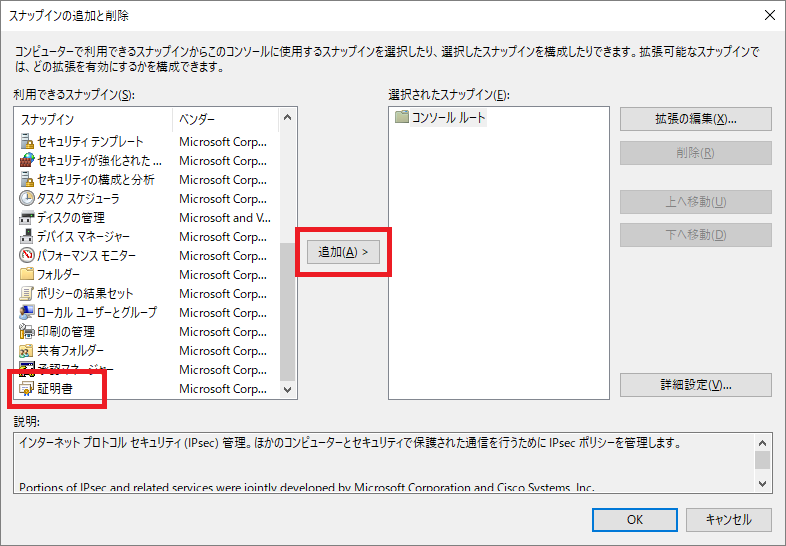 [ファイル]から[スナップインの追加と削除]を選択します。続けて、[証明書]を選択して[追加]を押します。