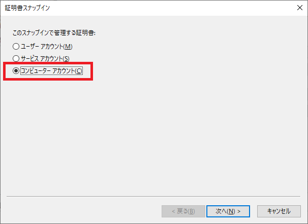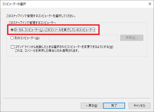 [コンピュータアカウント]を選択して続行します。次に[ローカルコンピュータ]を選択して続行します。