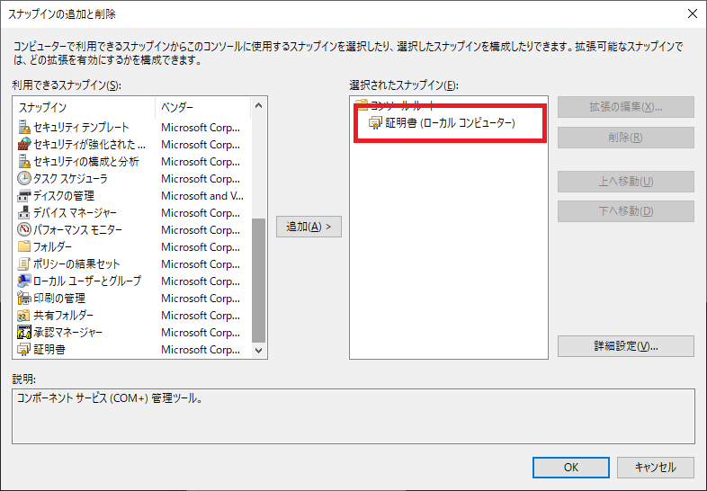 [証明書(ローカルコンピューター)]が追加されたことを確認して「OK」を押します。