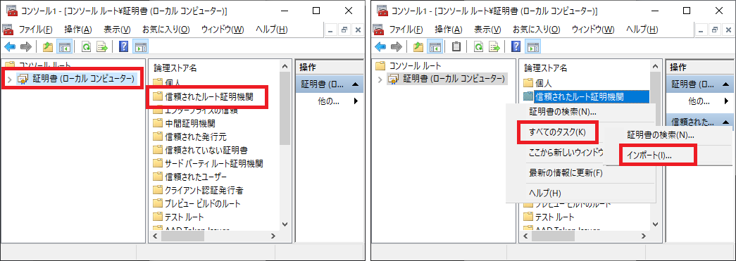 [証明書(ローカルコンピューター)]を選択して、[信頼されたルート証明機関]を右クリックします。[すべてのタスク]を選択し[インポート]を選択します。