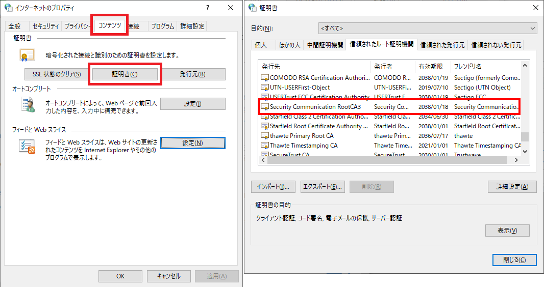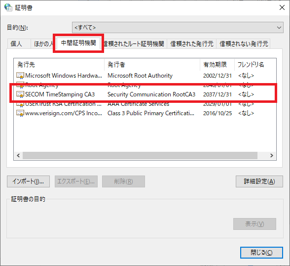 インストール方法は上記のルートCA証明書(SCRoot3ca.cer)の方法と同じです。