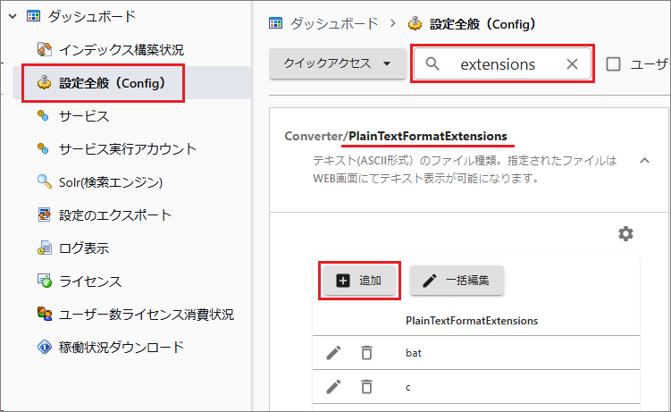 ※ 5.のインデックス再構築の実施の前に、新たに追加した拡張子のテキストファイルをアップロードしたり、小規模なフォルダてインデックス再構築を実行して検索インデックスの登録可否を確認してください。