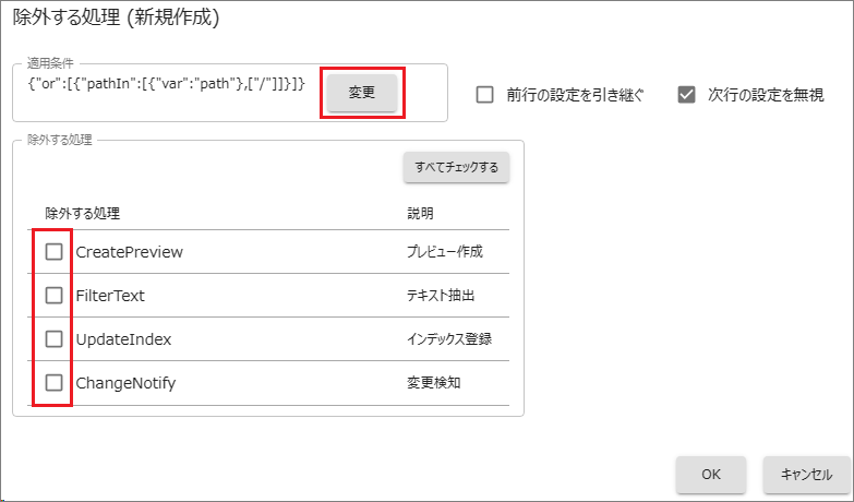 除外対象は[全文検索][ファイル名検索][プレビュー]の3つの組み合わせでルールを登録できます。