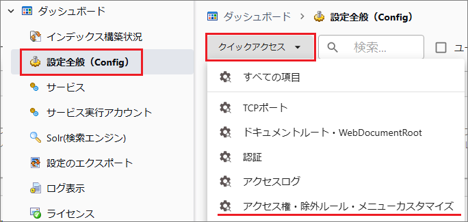 [管理ツール > 設定全般 > クイックアクセス > アクセス権・除外ルール・メニューカスタマイズ]を選択します。