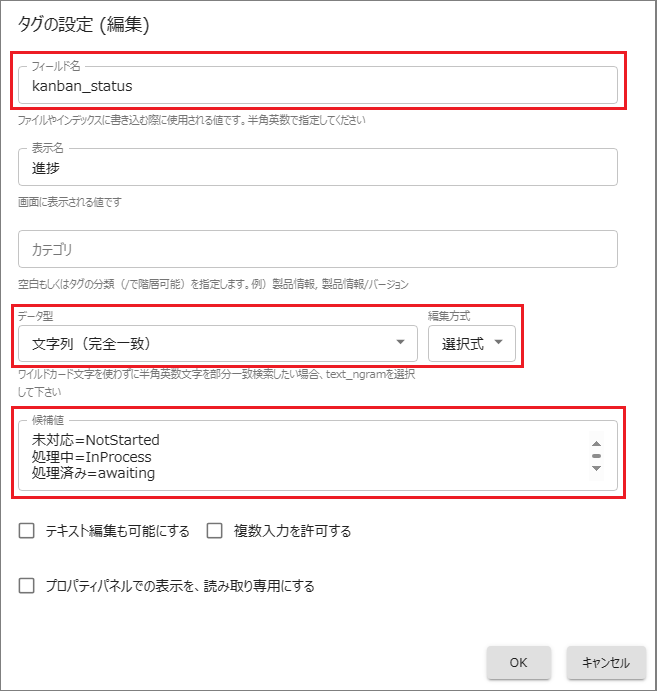 フォルダ(定義したタグの情報が未登録の場合)をカンバンとして配列させる最初のレーンを指定します。この段階ではフォルダのタグに値は登録されません。定義したタグ項目の候補値