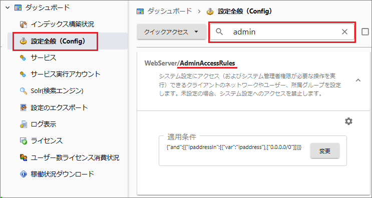 [WebServer/AdminAccessRules > 変更]を選択して適用条件を編集します。