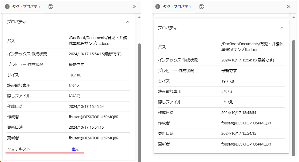 プロパティに表示される[全文テキスト]が非表示になります。