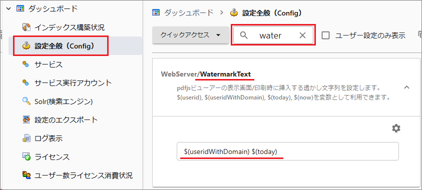 [管理ツール > 設定全般 > water]で検索します。