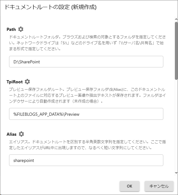 DocumentRootAlias: SharePoint接続用フォルダのエイリアス値を指定します。