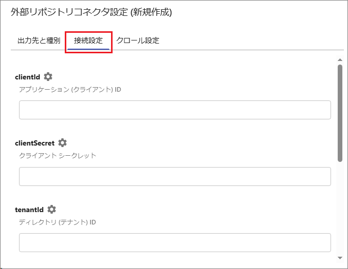 [接続設定]タブの次の3項目には、Azure Portalに作成した認証アカウントの情報を登録します。