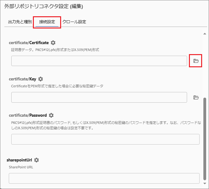 [接続設定]タブの次の3項目には、自己署名証明書の情報とSharePoint OnlineのURLを登録します。