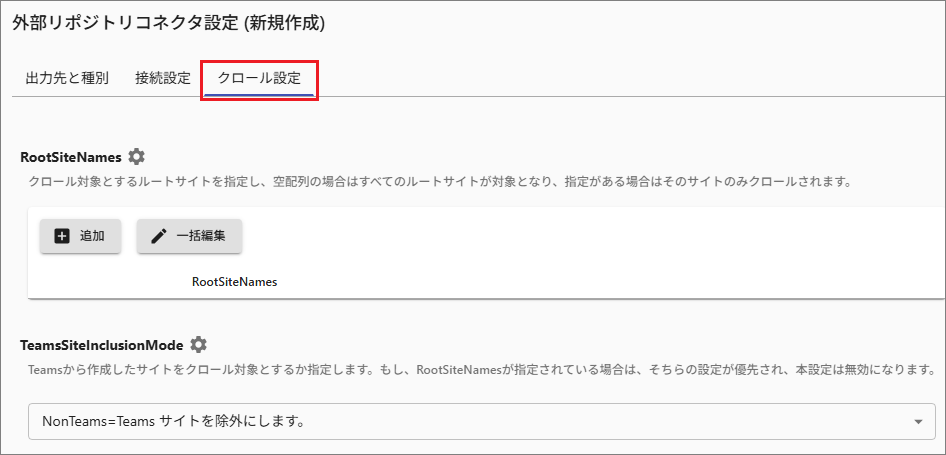 TeamsSiteInclusionMode: Teamsで作成したサイトをクロール対象に含める/含めいないを指定できます。