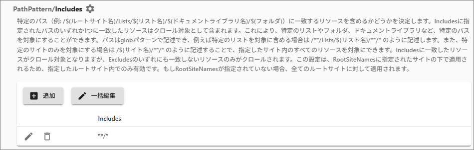 Includes: 指定した特定パスに一致するリソースをクロール対象に含めます。パスは複数指定でき、いずれかのパスに一致し、かつExcludesのいずれのパスにも一致しないリソースがクロールされます。