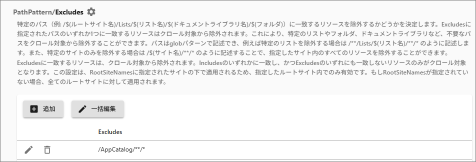 Excludes: 指定した特定パスに一致するリソースをクロール対象から除外します。パスは複数指定でき、いずれかのパスに一致するリソースが対象から除外されます。不要なパス(リスト、フォルダ、ドキュメントライブラリなど)を対象から除外できます。パスの指定方法はIncludesと同様です。