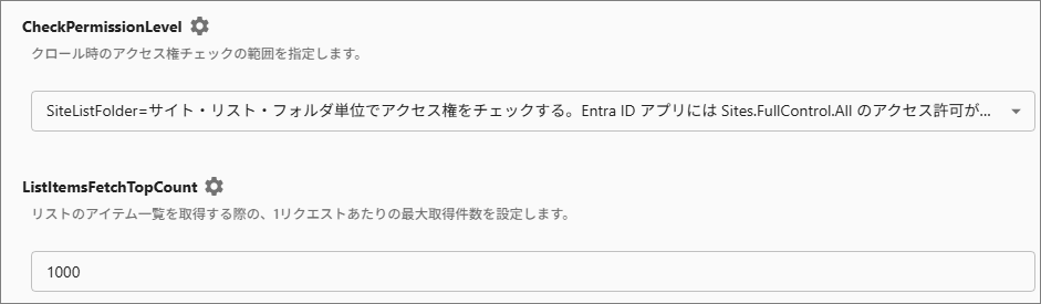 CheckPermissionLevel: 適用するアクセス権限の範囲を指定します。[ALLItems]を選択するとクロール時間が伸長します。
