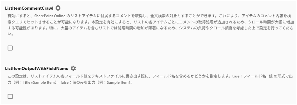 ListItemCommentCrawl: リストアイテムに付加されているコメント情報をクロール対象に含めることができます。有効にするとコメント情報が検索対象になります。なおアイテム量やコメント量によりクロールの処理時間が長くなります。