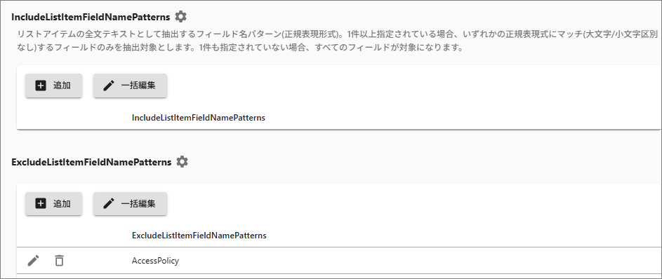 IncludeListItemFieldNamePatterns: 全文検索の対象にするリストアイテムのフィールド名をパターン(正規表現形式)で指定できます。複数指定ができ、いずれかの正規表現式に適合(大文字/小文字区別なし)するフィールドのテキスト情報を抽出対象とします。無指定は全てのフィールドが対象です。