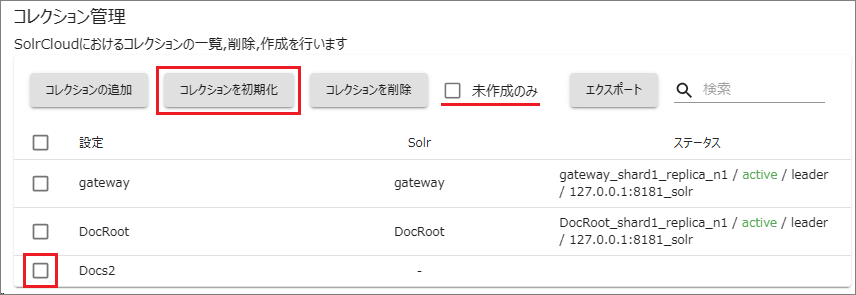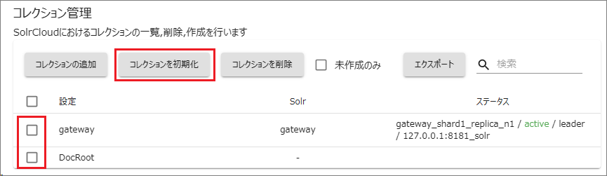 新しく追加されたコレクション(ドキュメントルート)にチェックを入れて[コレクションを初期化]を選択します。