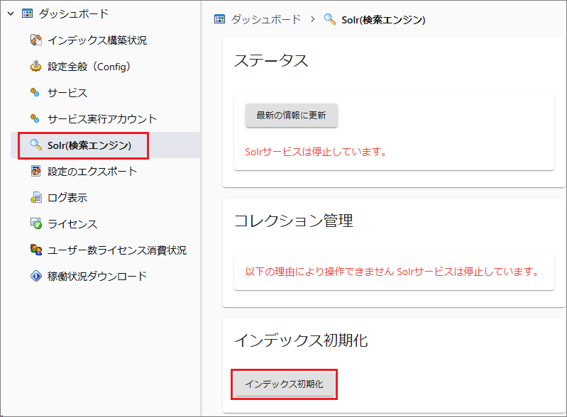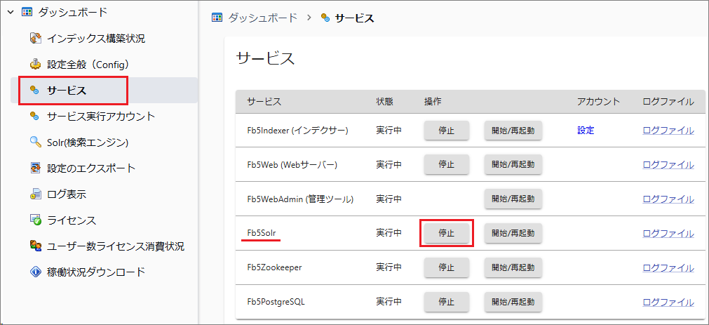 [管理ツール > サービス > Solr]を停止します。
