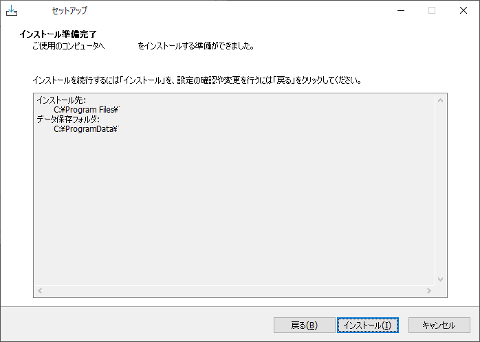 インストールフォルダとデータフォルダを確認して[インストール]を選択してください。
