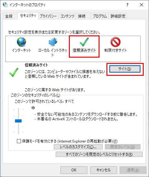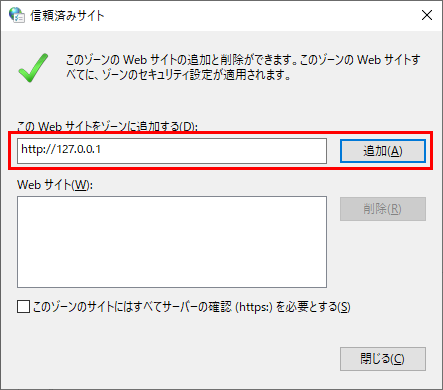 「インターネットのプロパティ」の信頼済サイトにWEBサイトを追加します。