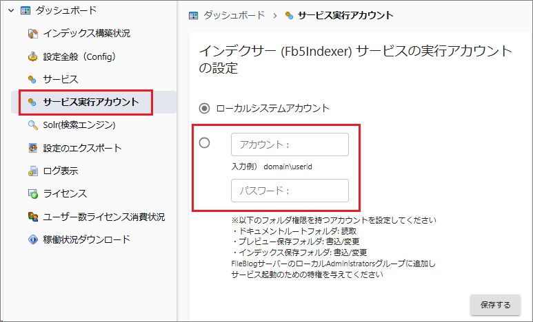次の条件を満たすユーザーアカウントを用意してインデクサー(Fb5Indexer)サービスの実行ユーザーアカウントに登録します。