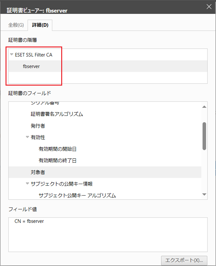 WEBブラウザでサーバー証明書の内容を表示させると、下図のように「証明書の階層」が意図しない階層(ルート)になっているかもしれません。