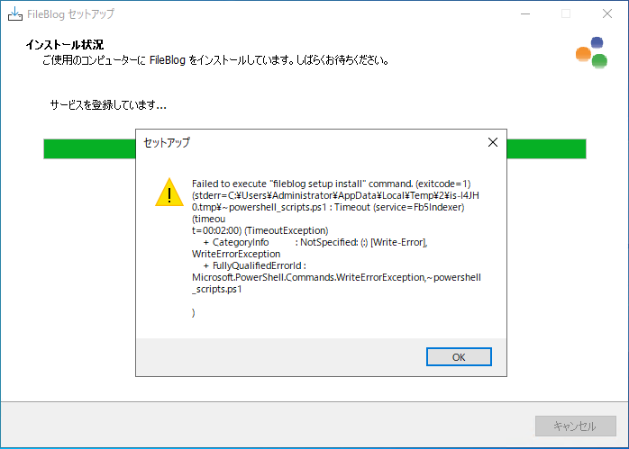 バージョンアップのときに更新用インストールプログラムを実行すると、「サービスを登録しています」の段階でタイムアウトエラーになることがあります。