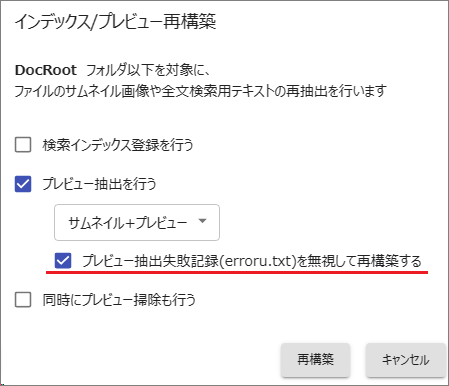 プレビュー作成時に[プレビュー抽出失敗記録(erroru.txt)を無視して再構築する] を選択して実行します。