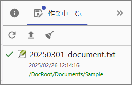 [作業中一覧]から操作を実行できるようするには、ファイル名や保存フォルダを変更せずに「上書き保存」します。[作業コピーを削除]または[更新されていないファイルを一覧から削除]で削除したファイルは、PCのごみ箱に残らず完全に削除されます。