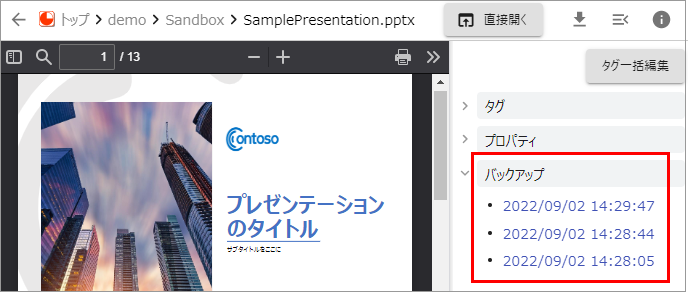 ONLYOFFICE連携で自動バックアップ機能が有効になっている場合、上書き保存されたファイルについて直前の状態のバックアップを一定期間保管します。