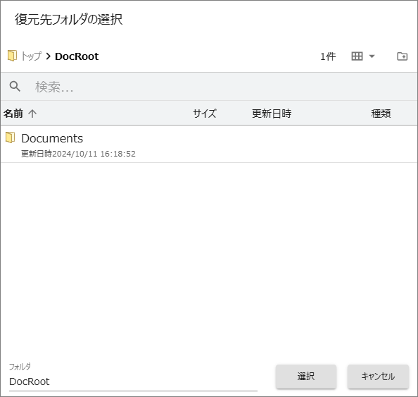 別のフォルダに復元するには、ダイアログで戻し先フォルダを選んでから[選択]を実行します。