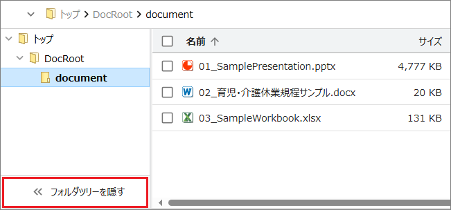 フォルダツリーの下側にある[フォルダツリーを隠す]を選択すると、フォルダツリー領域が畳まれて非表示になります。
