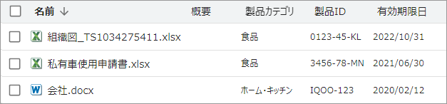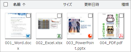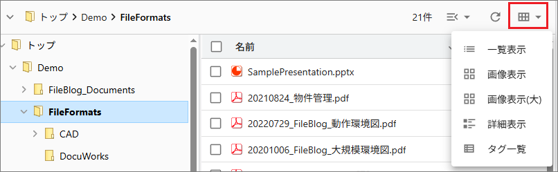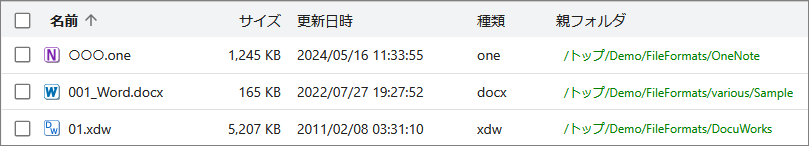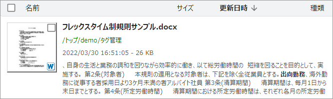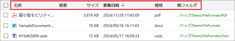 ファイル名・ファイルサイズ・更新日時・ファイル種類・親フォルダ[1]・タグ項目名を選択すると昇順/降順の並び替えができます。