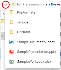 パスの左隣にある[V]マークを選択すると[最近開いたファイル/フォルダ]の履歴が表示されて選択できます。